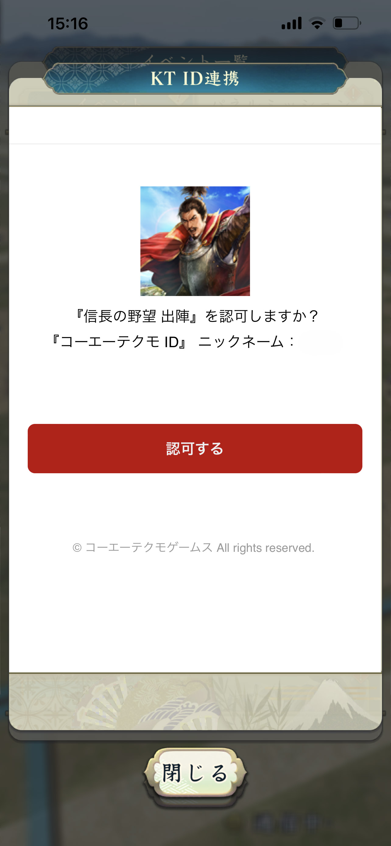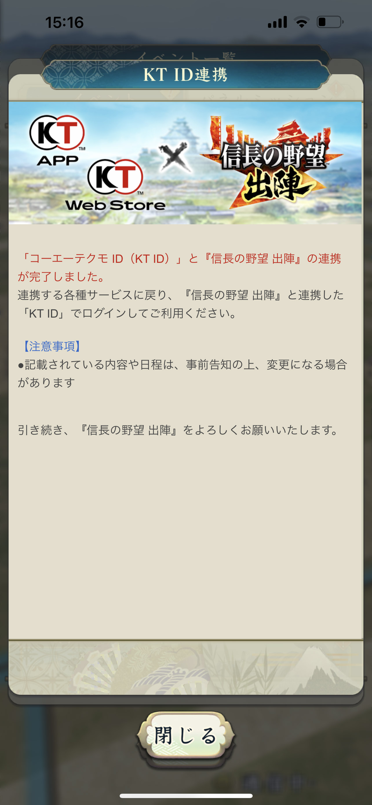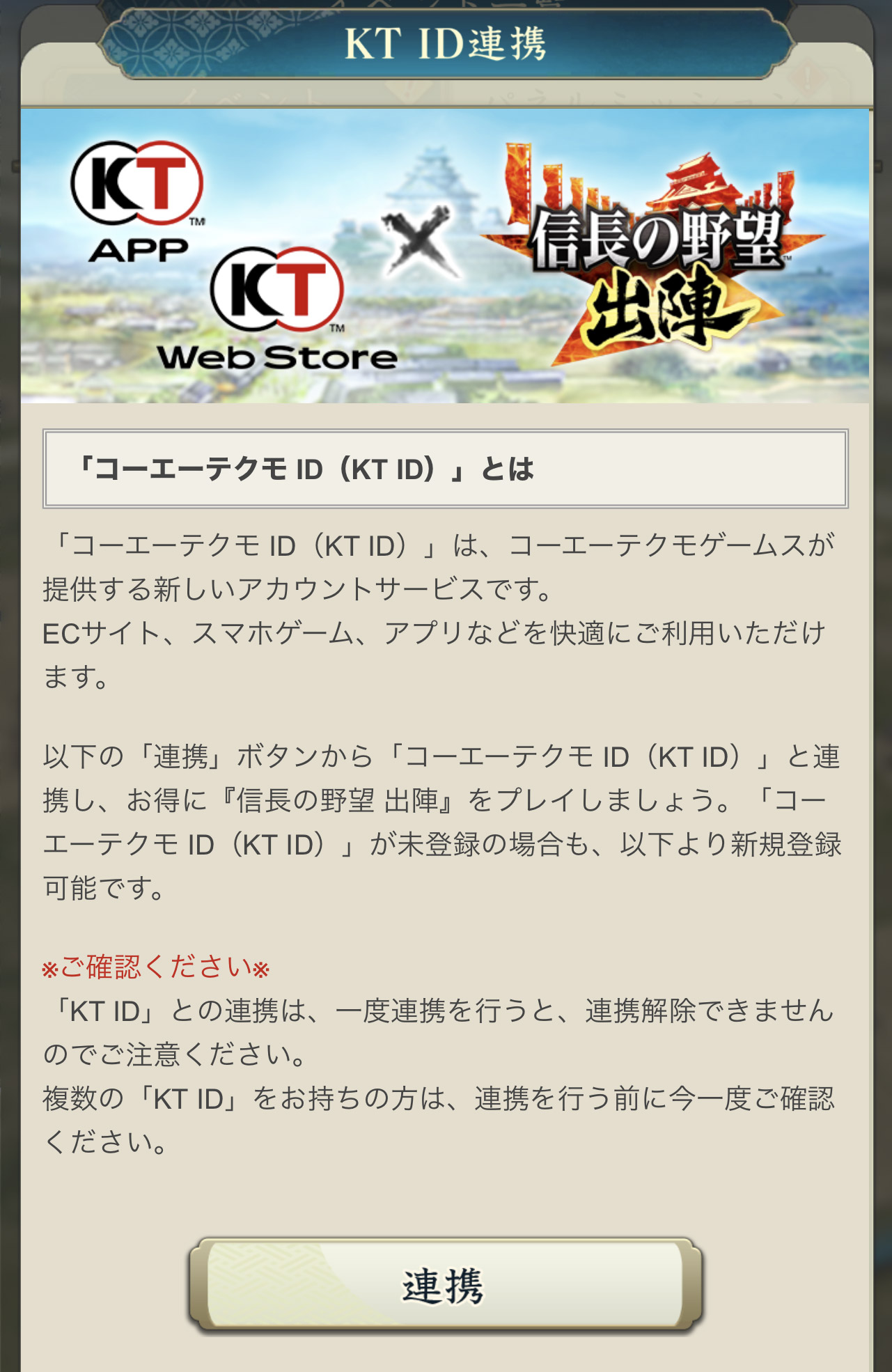 『信長の野望 出陣』と「コーエーテクモ ID(KT ID)」との連携は、一度連携を行うと、連携解除できませんのでご注意ください。複数の「コーエーテクモ ID(KT ID)」をお持ちの方は、連携を行う前に、今一度ご確認ください。