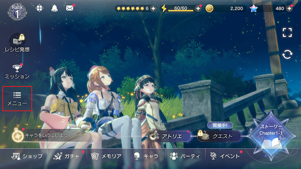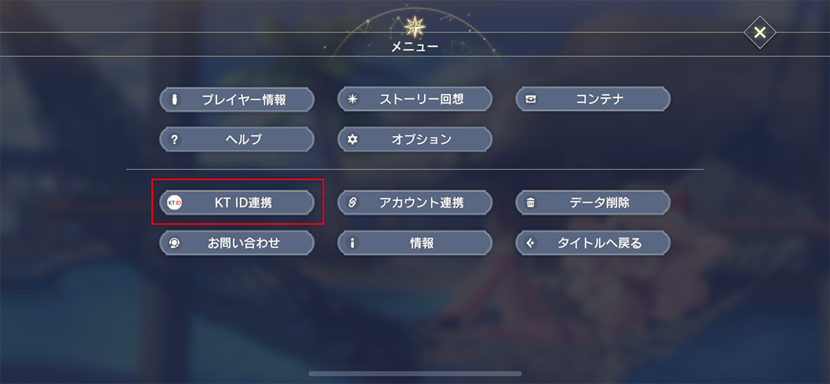 ②インストールした『レスレリアーナのアトリエ』の[メニュー]のボタンから、[KT ID連携]のボタンを選択してください。