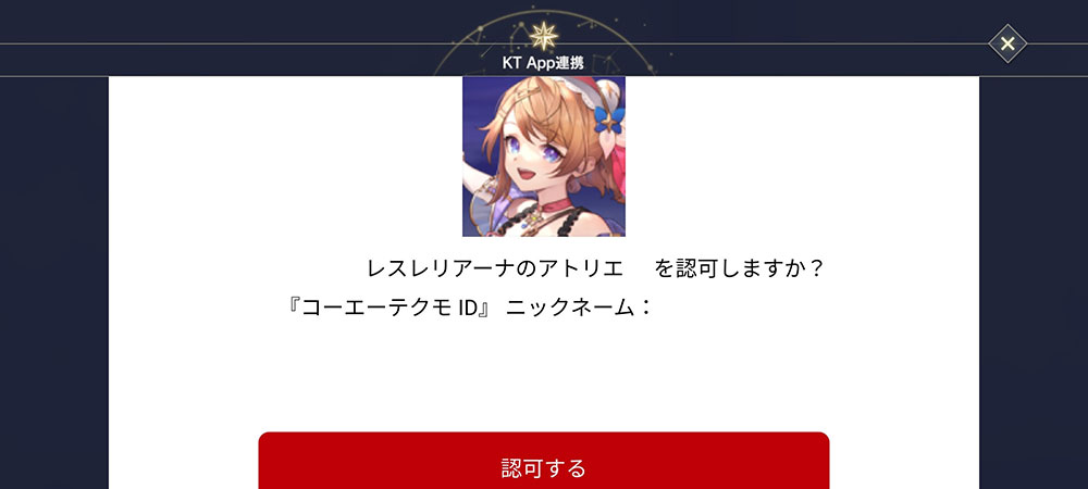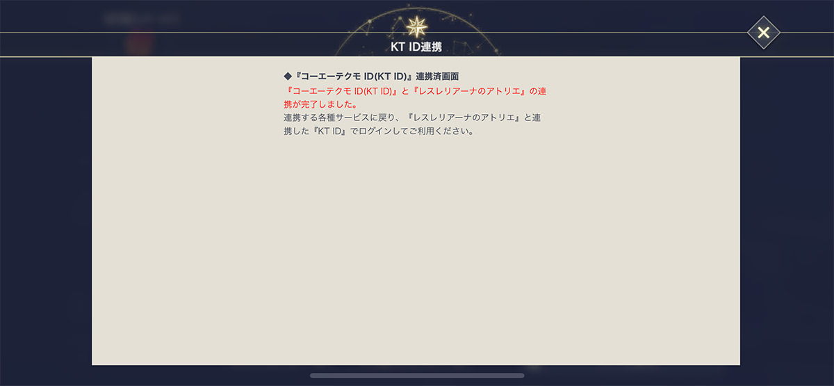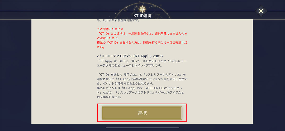 『レスレリアーナのアトリエ』と「コーエーテクモ ID(KT ID)」との連携は、一度連携を行うと、連携解除できませんのでご注意ください。複数の「コーエーテクモ ID(KT ID)」をお持ちの方は、連携を行う前に、今一度ご確認ください。